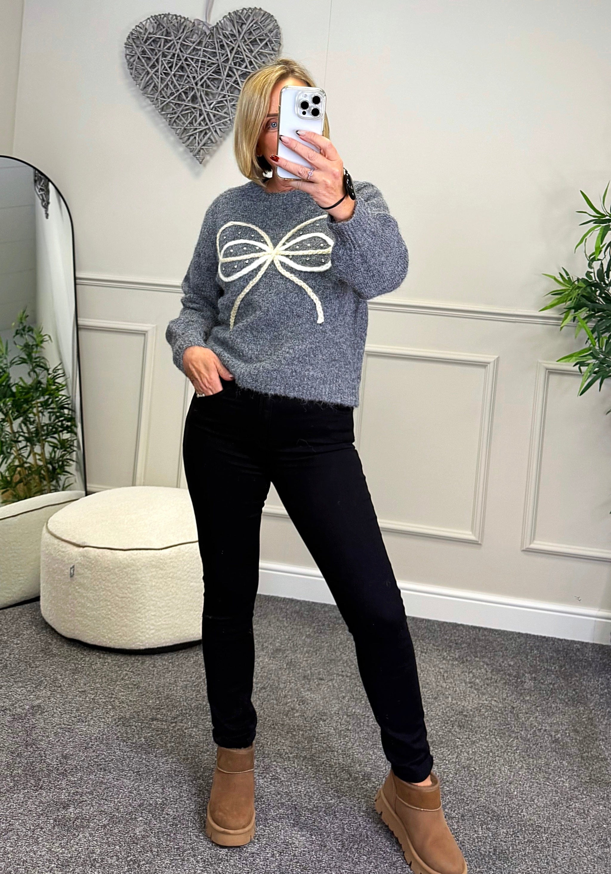 Elevate your winter style with the Anna Soft Knit Jumper in Charcoal Grey. Designed with textured 3D bows and sparkling gemstone embellishments, this cosy knit brings subtle glamour to everyday comfort.