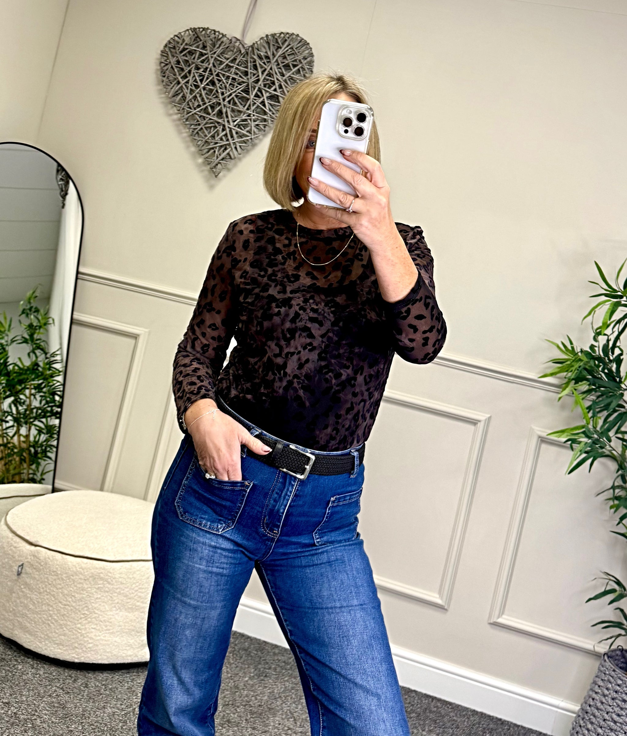 Make a statement with this stunning flocked leopard print mesh top. The luxurious flocked texture adds depth and dimension to the classic leopard pattern, creating a sophisticated yet bold look.