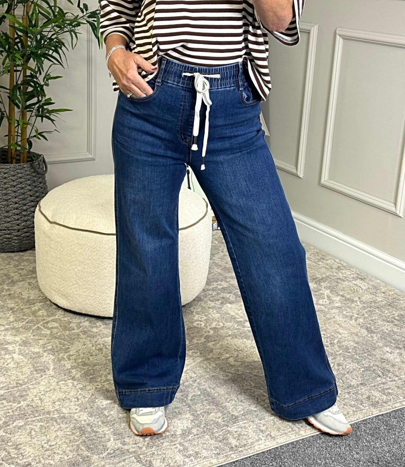 Effortless style meets comfort with these wide-leg jeans, crafted in soft stretch denim and finished with a relaxed drawstring waist.