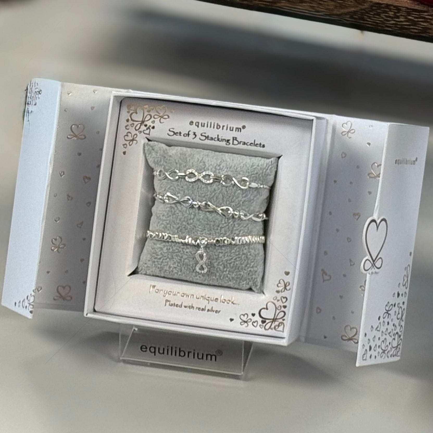 A beautifully coordinated set of three silver-plated infinity bracelets, elegantly gift boxed and perfect for celebrating love, friendship, and meaningful moments.
