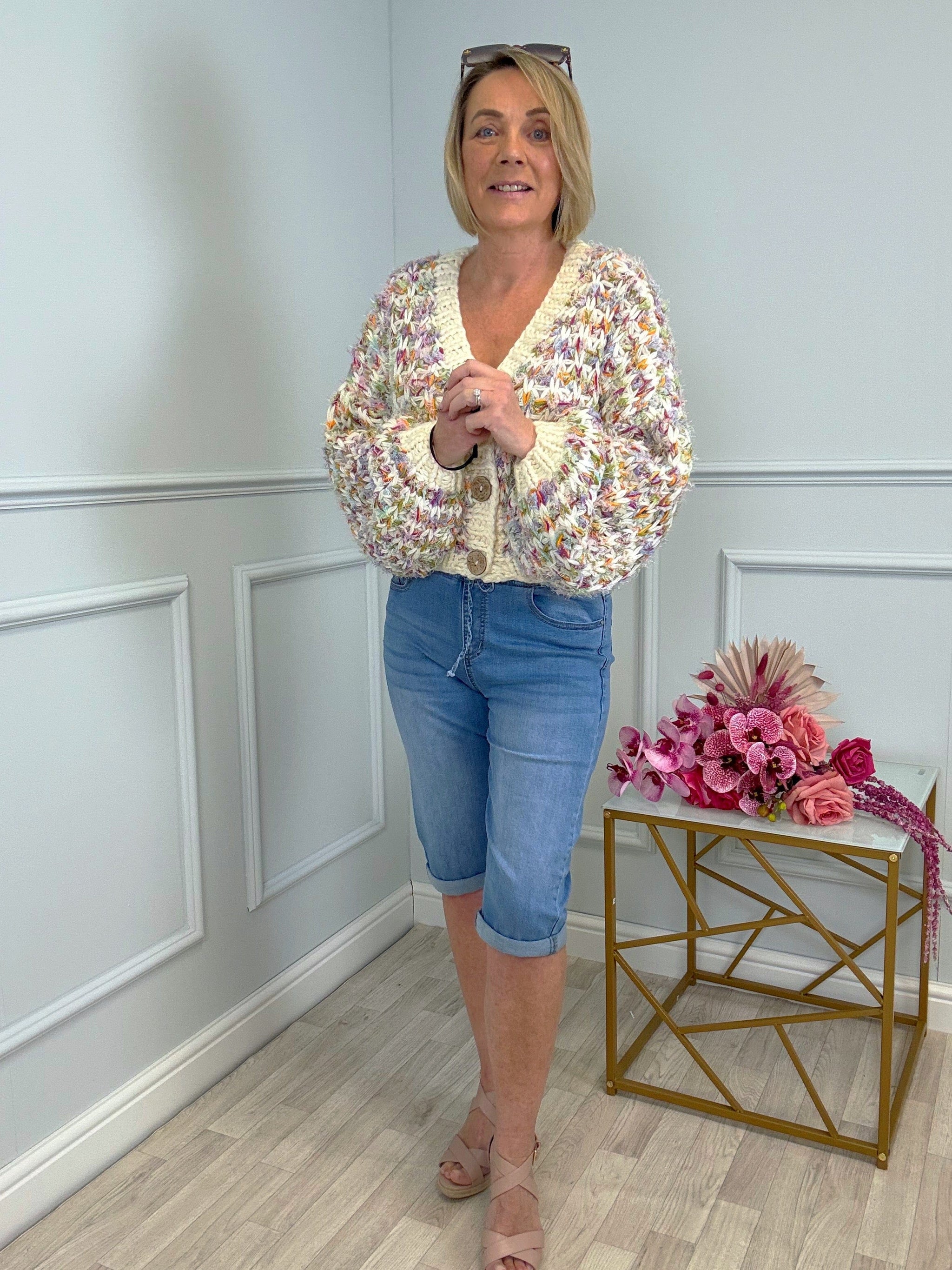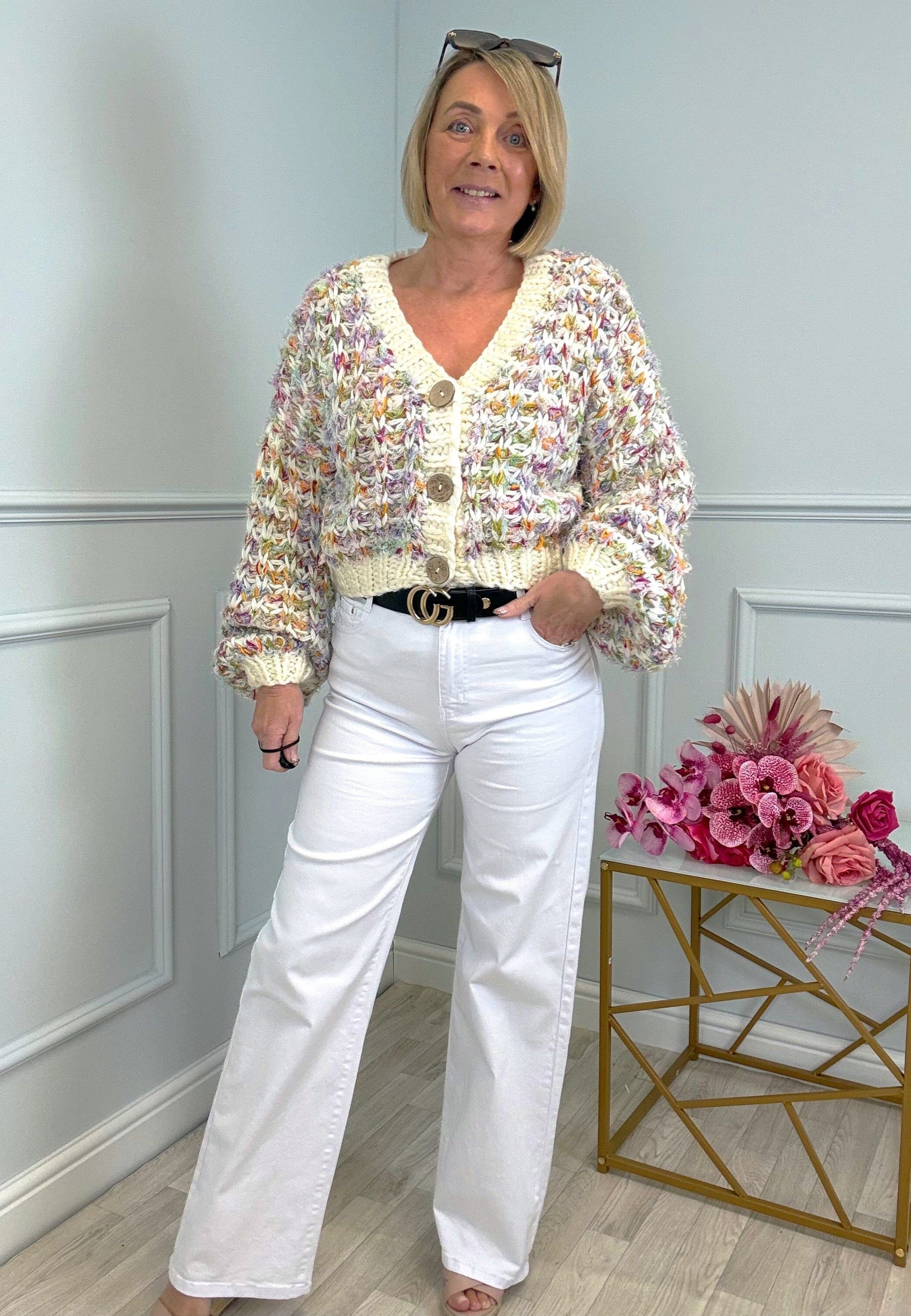 Lovingly hand made , Meet the Juniper Chunky Rainbow Fleck Button-Up Cardigan — the ultimate cosy layer with a splash of colour and charm. This standout piece features a chunky cream knit base woven with flecks of rainbow-hued yarn for a playful, eye-catching twist. Finished with a classic button-up front and statement wooden buttons, Juniper blends comfort with boutique flair.