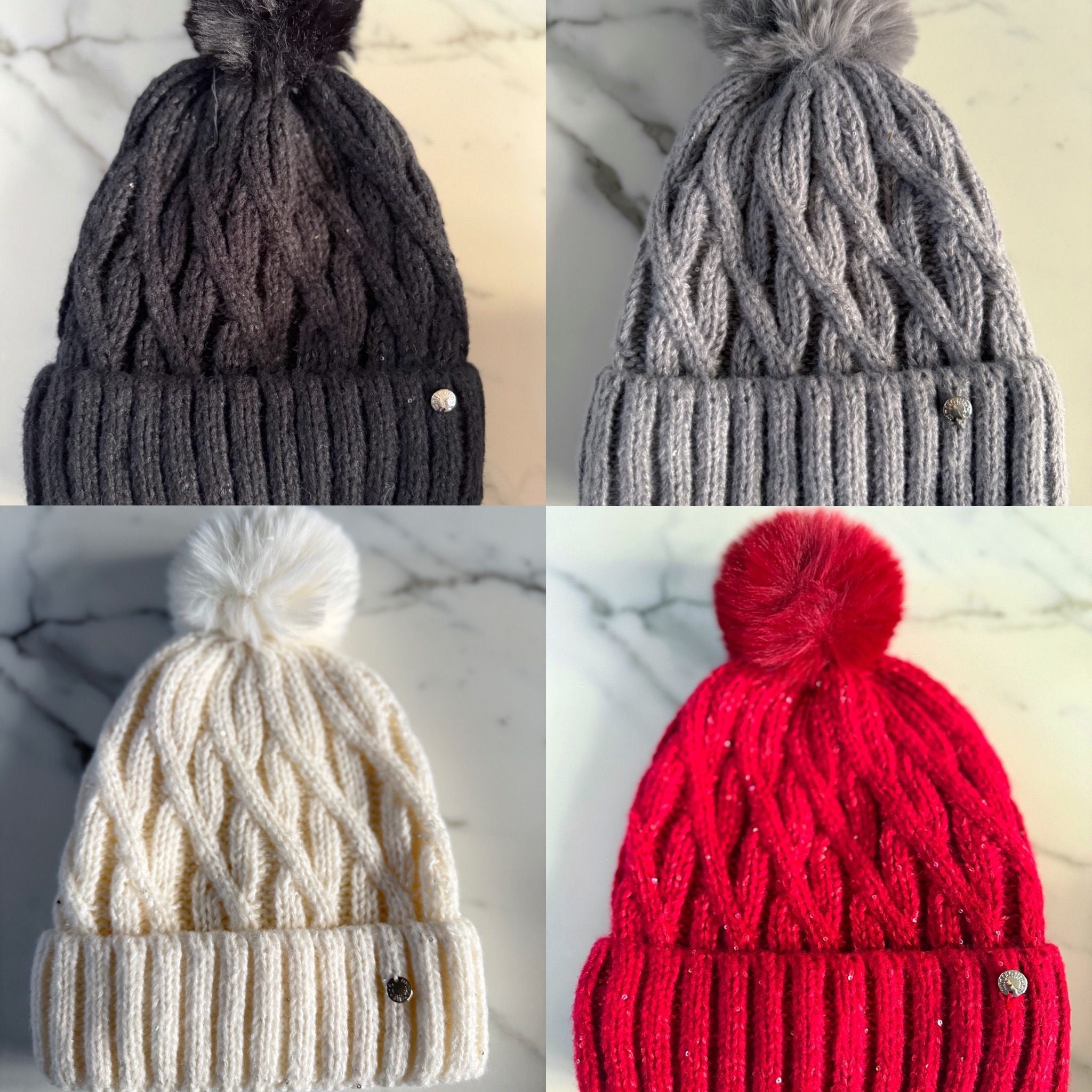 A cosy winter essential with a touch of sparkle — this metallic fleck pom pom hat keeps you warm while adding a stylish shimmer to your cold-weather wardrobe.