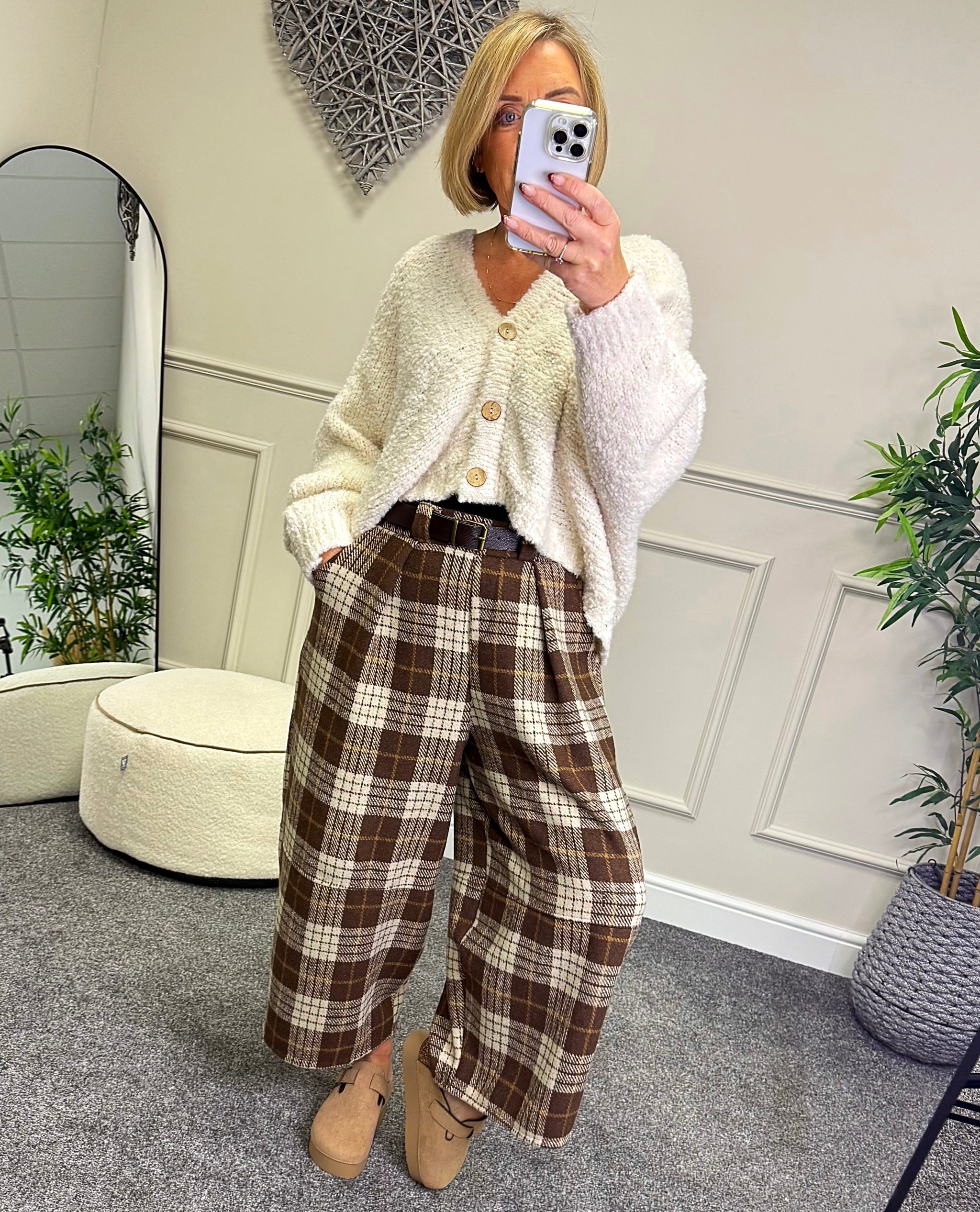 Soft brushed cocoon trousers in a chic chocolate and cream check — warm, stylish and easy to wear.