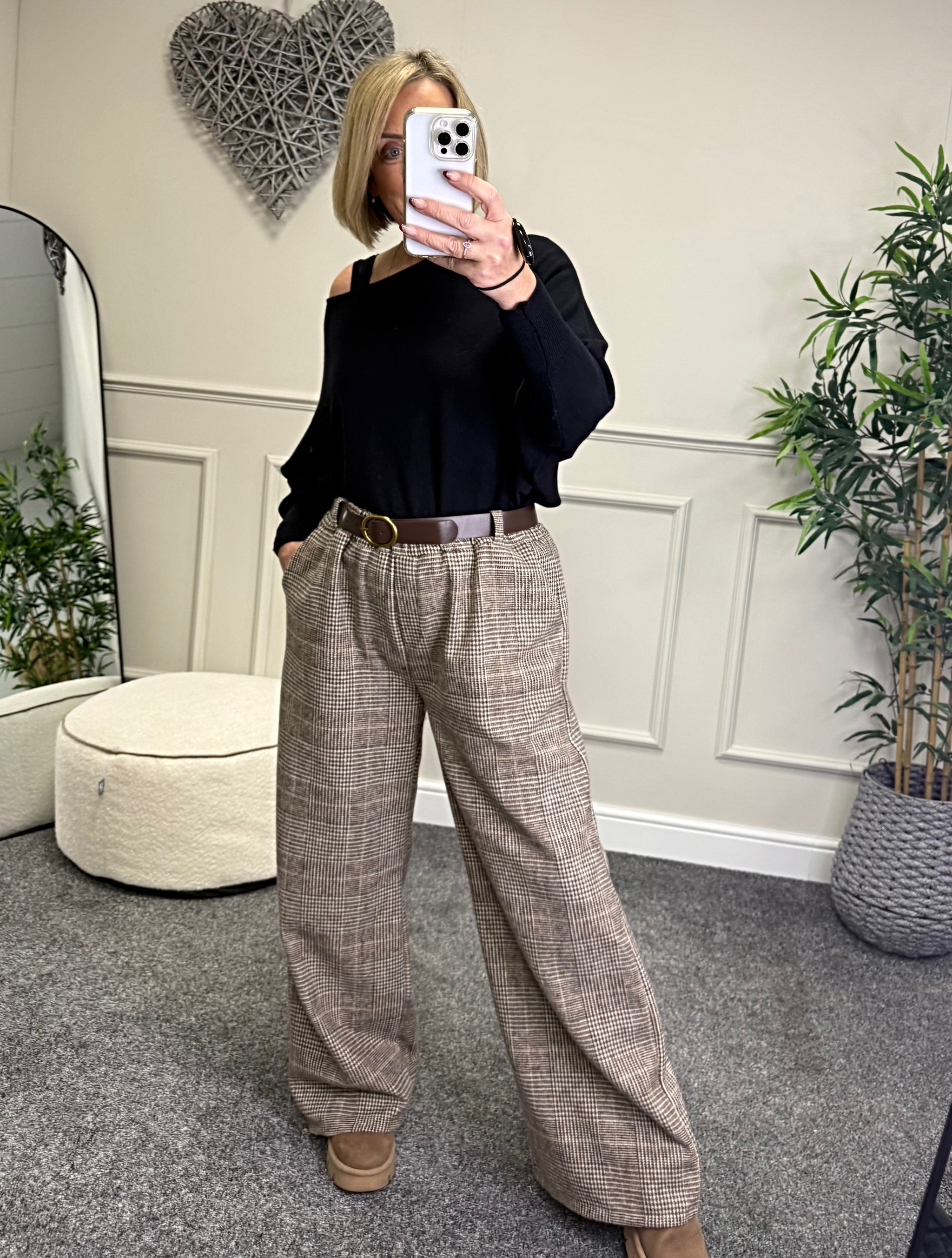 Elevate your autumn-winter wardrobe with the Seraphina brushed check wide leg trousers. Crafted in a sophisticated houndstooth-inspired check pattern, these trousers blend timeless style with contemporary comfort.