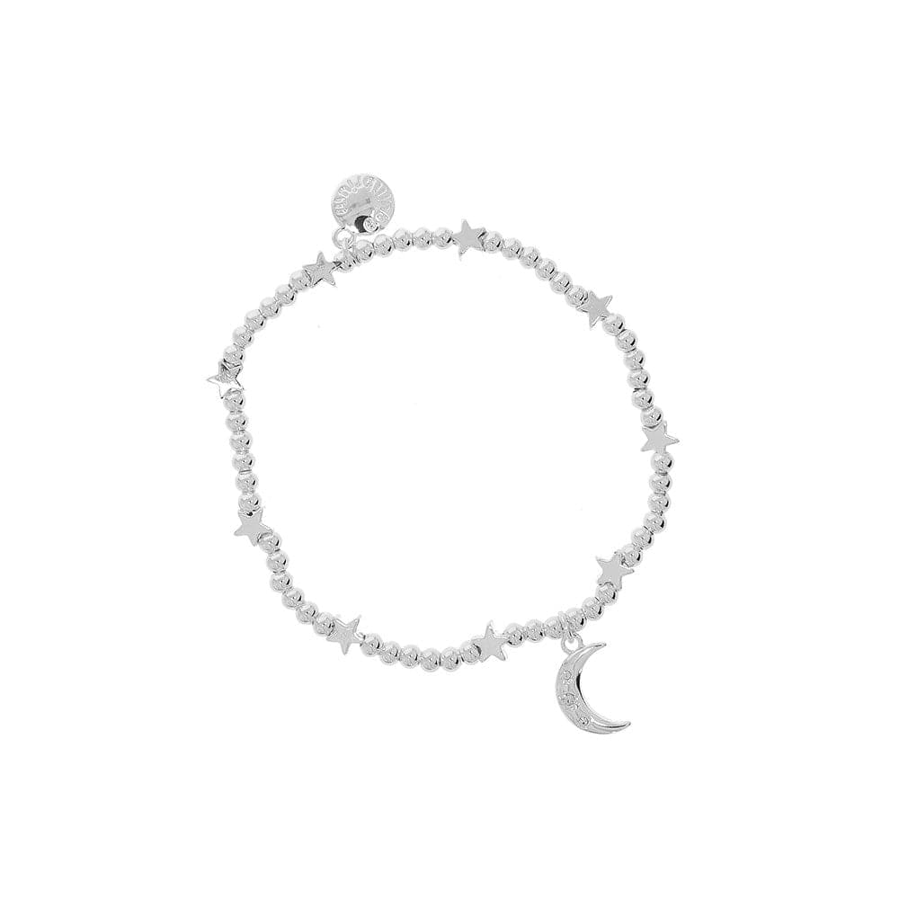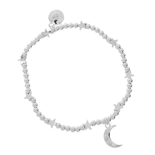 A delicate silver-plated bracelet featuring star detailing and a crescent moon charm for effortless celestial sparkle.