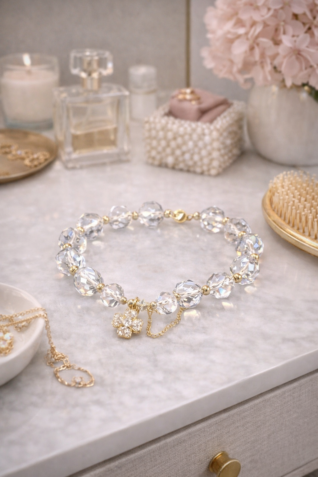 Featuring faceted iridescent beads, soft gold spacers, and a tiny crystal flower charm, it catches the light beautifully and works perfectly for both daytime polish and evening elegance.