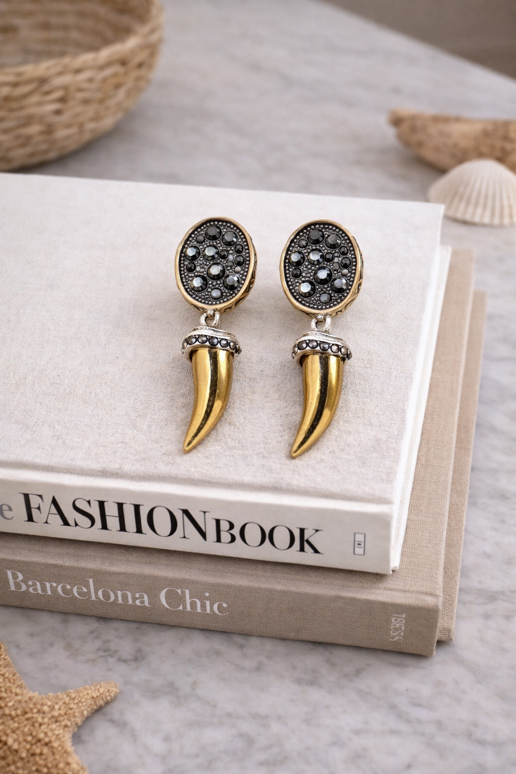 These statement earrings combine an ornate black medallion with a gleaming gold horn drop for a bold, powerful finish.