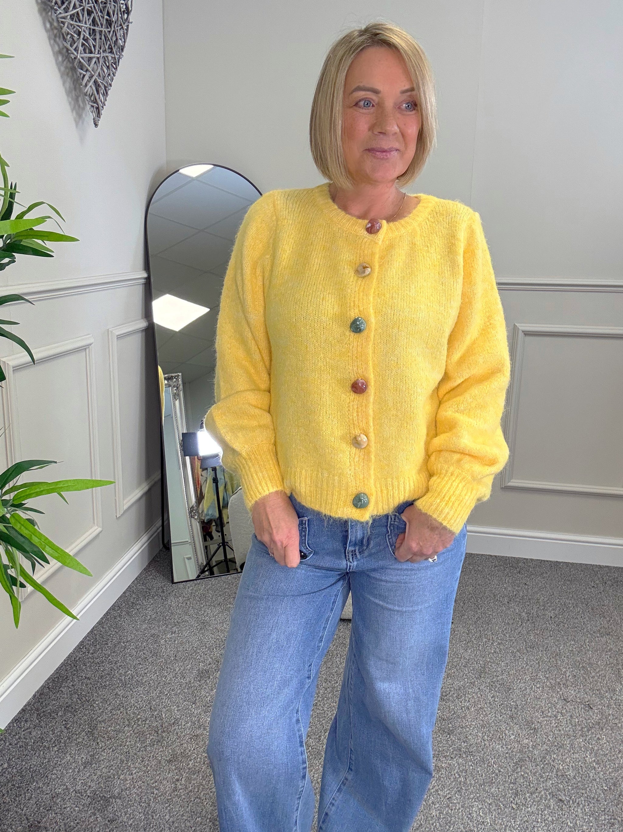 A beautifully soft, cosy cardigan with statement pebble-style buttons, perfect for effortless everyday layering.