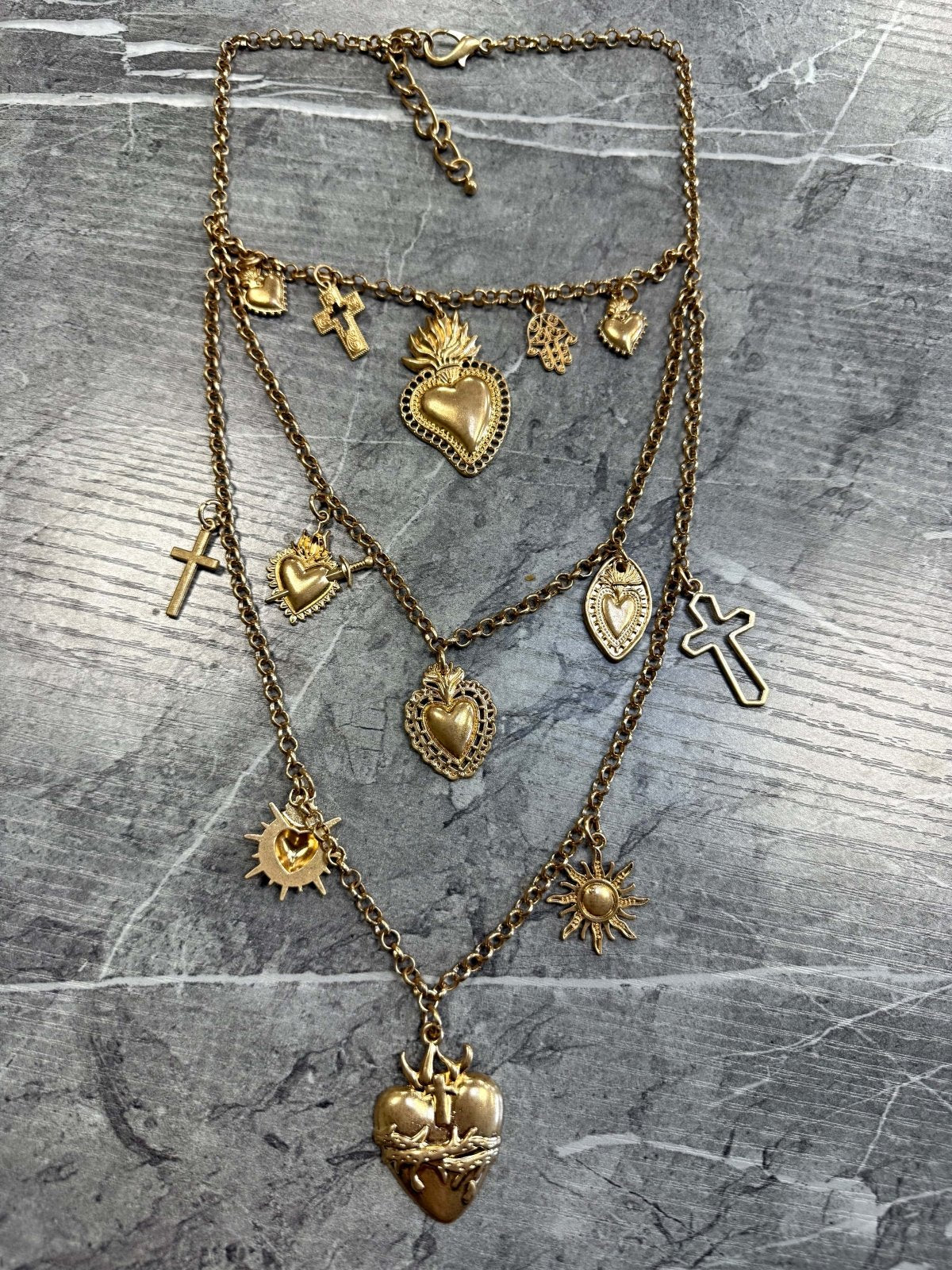 Turn heads with this stunning Gold Heart & Charm Layered Necklace, designed with layered chains adorned in detailed heart, cross, sun and symbolic charms. Its rich gold-tone finish adds a touch of vintage drama and modern mysticism — the perfect statement for boho lovers and bold dressers alike.