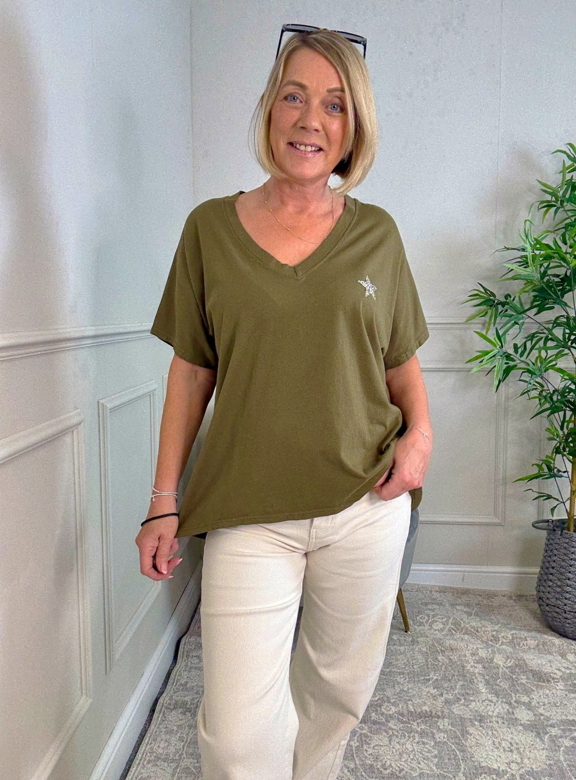 A khaki V-neck tee with sparkling star detail for effortless casual glam.
