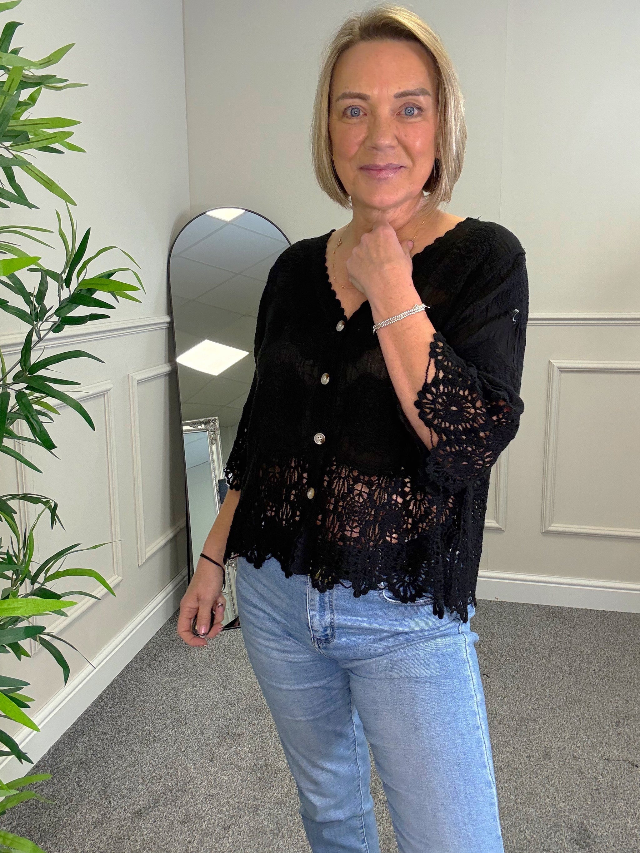 A lightweight sheer button top finished with delicate crochet trim, perfect for soft, feminine summer styling.