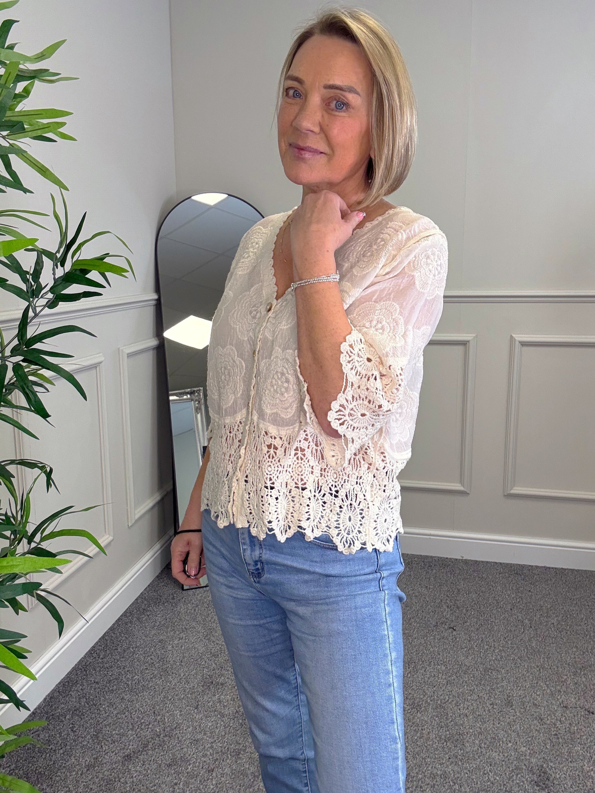 A lightweight sheer button top finished with delicate crochet trim, perfect for soft, feminine summer styling.