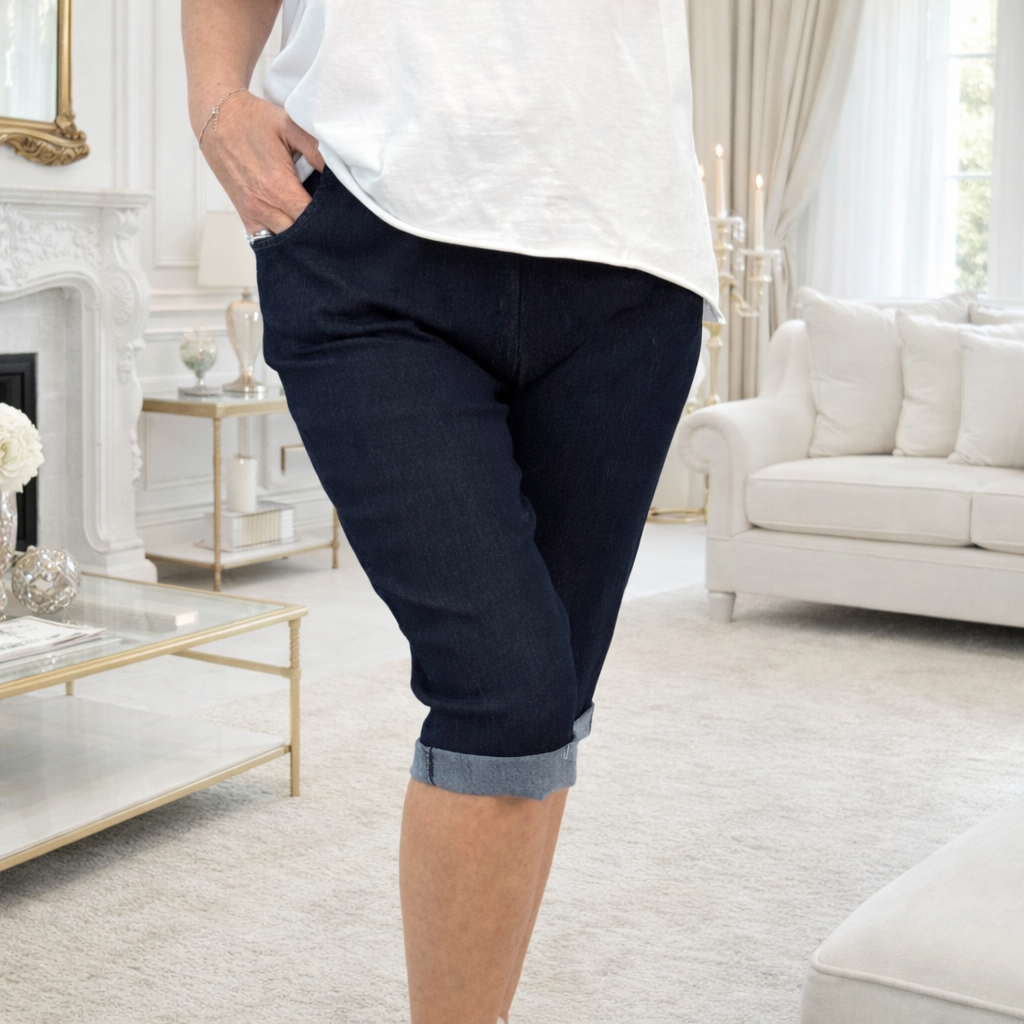 The Emma Magic Stretch Denim Shorts are designed for comfort and style.