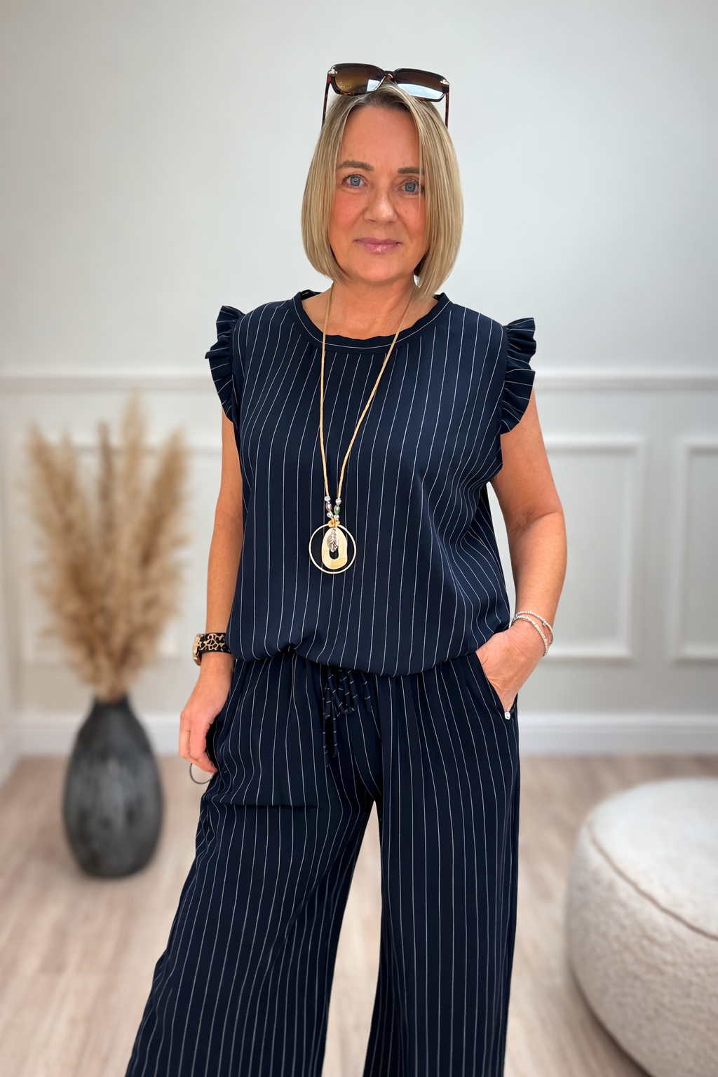 A chic and feminine pinstripe co-ord set with elegant frill shoulders and statement necklace included.