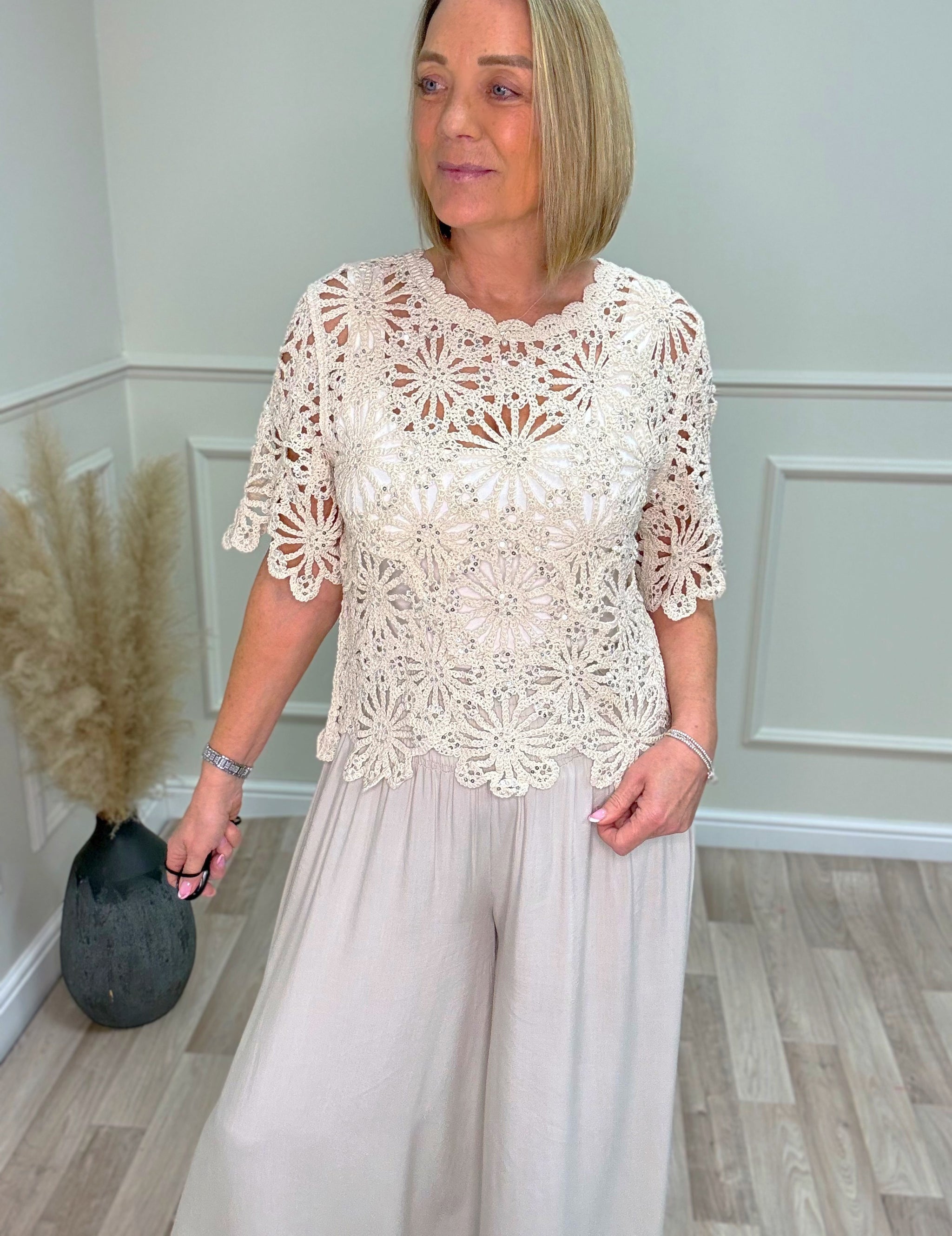A beautifully detailed crochet top with subtle sequin embellishment for an elegant, feminine finish.