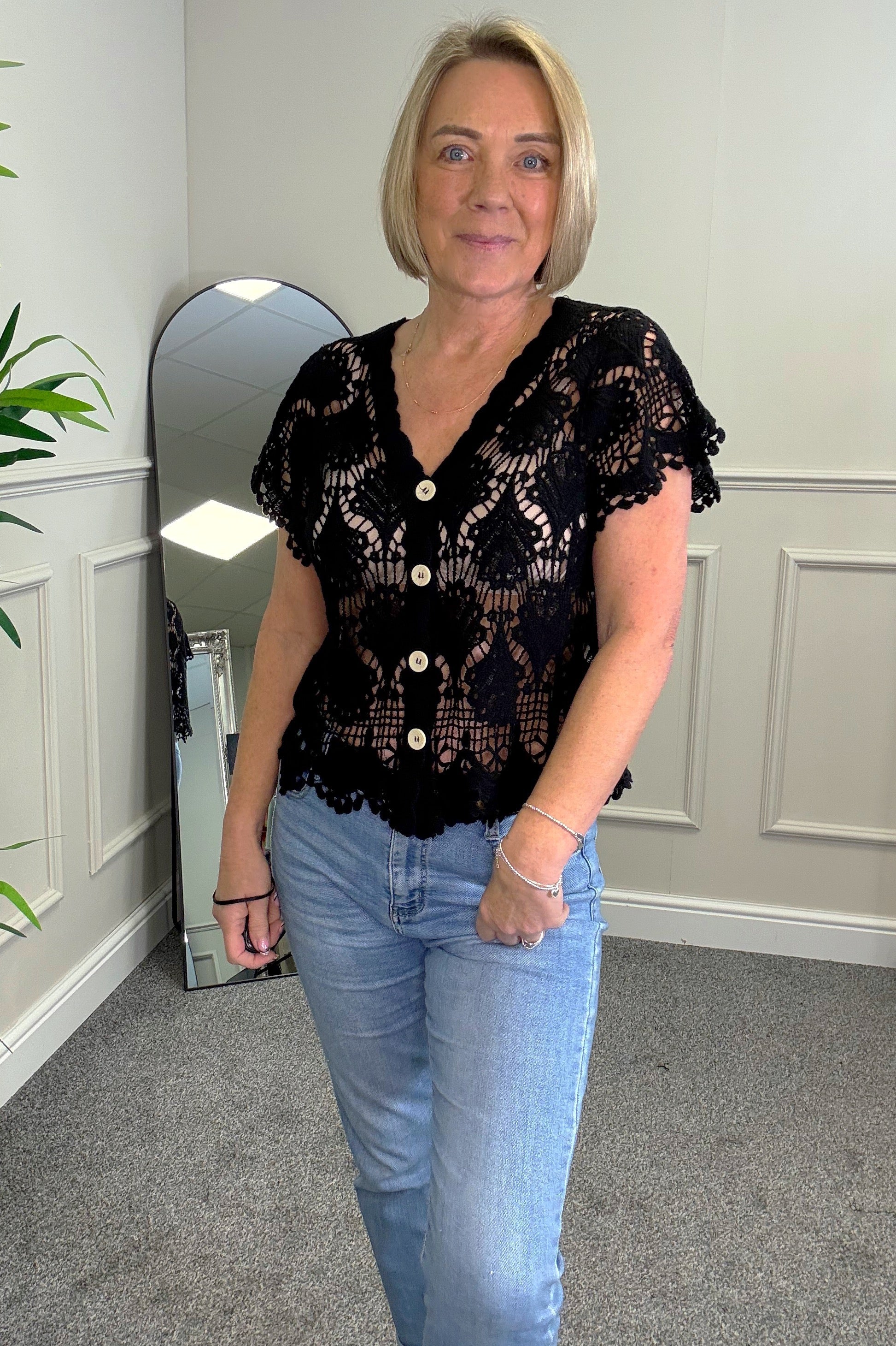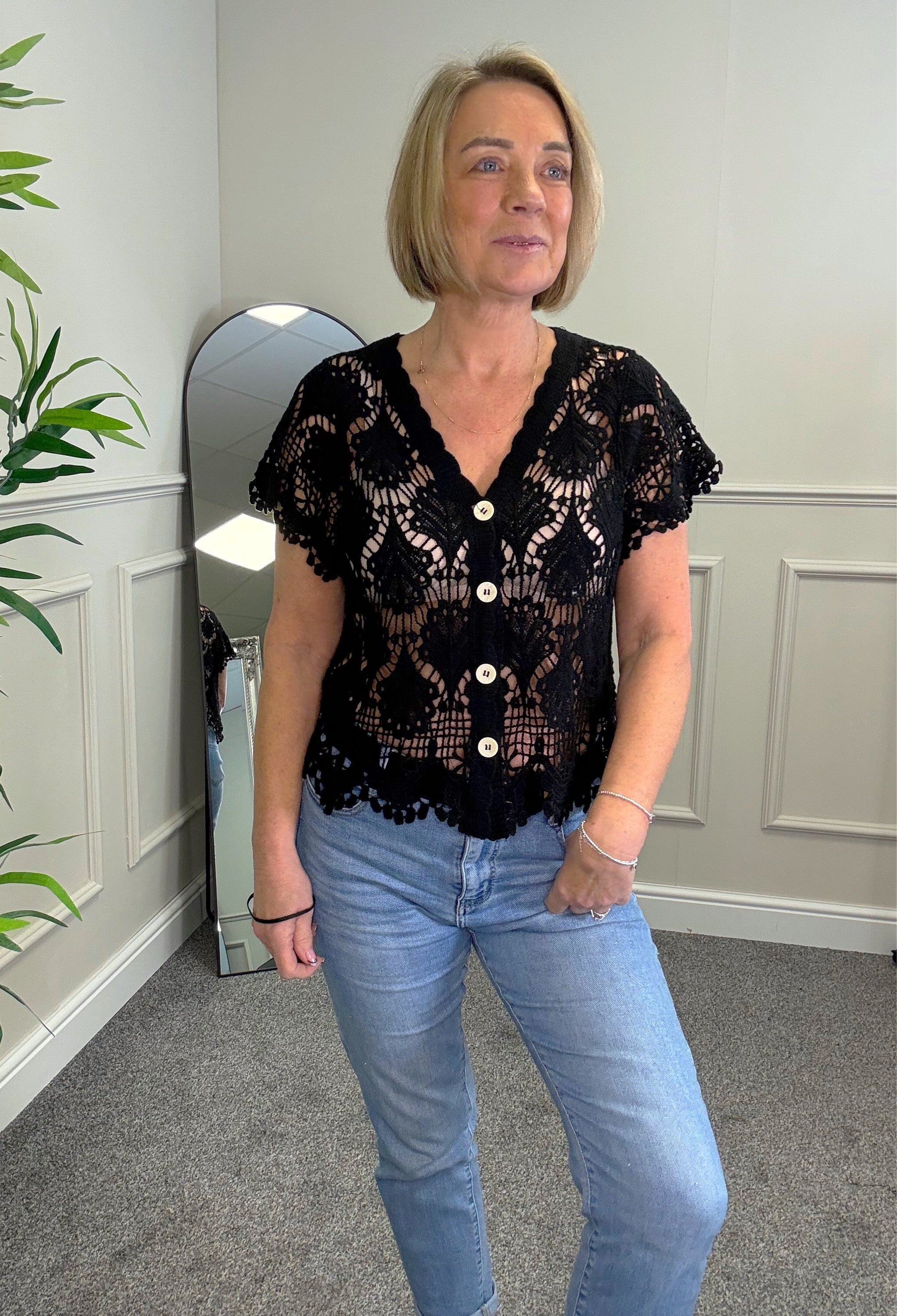 A beautifully crafted crochet lace button top with delicate detailing — perfect worn alone or layered for an effortless boutique look.