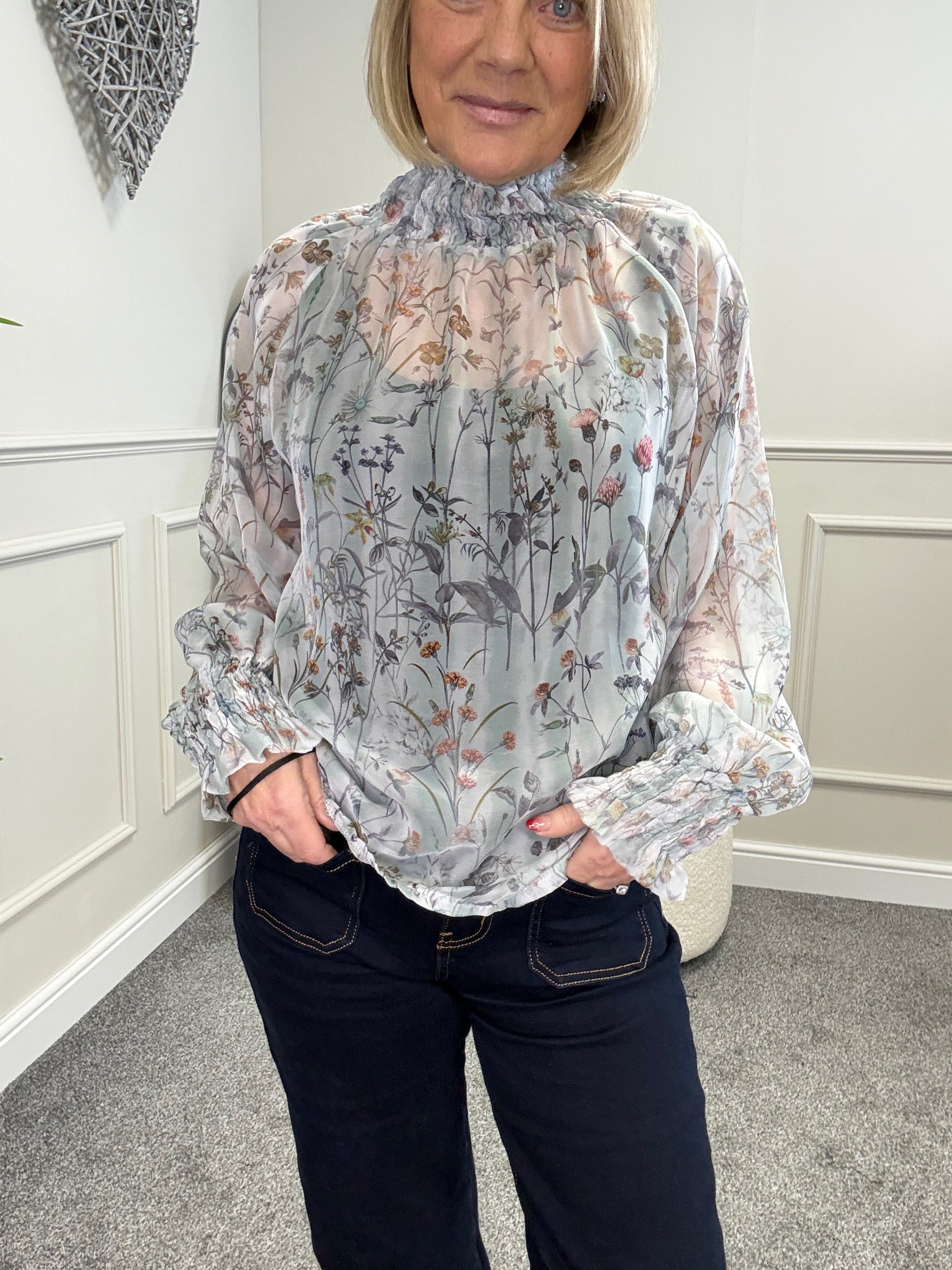 A beautifully lightweight floral blouse with soft sheerness and elegant detailing.