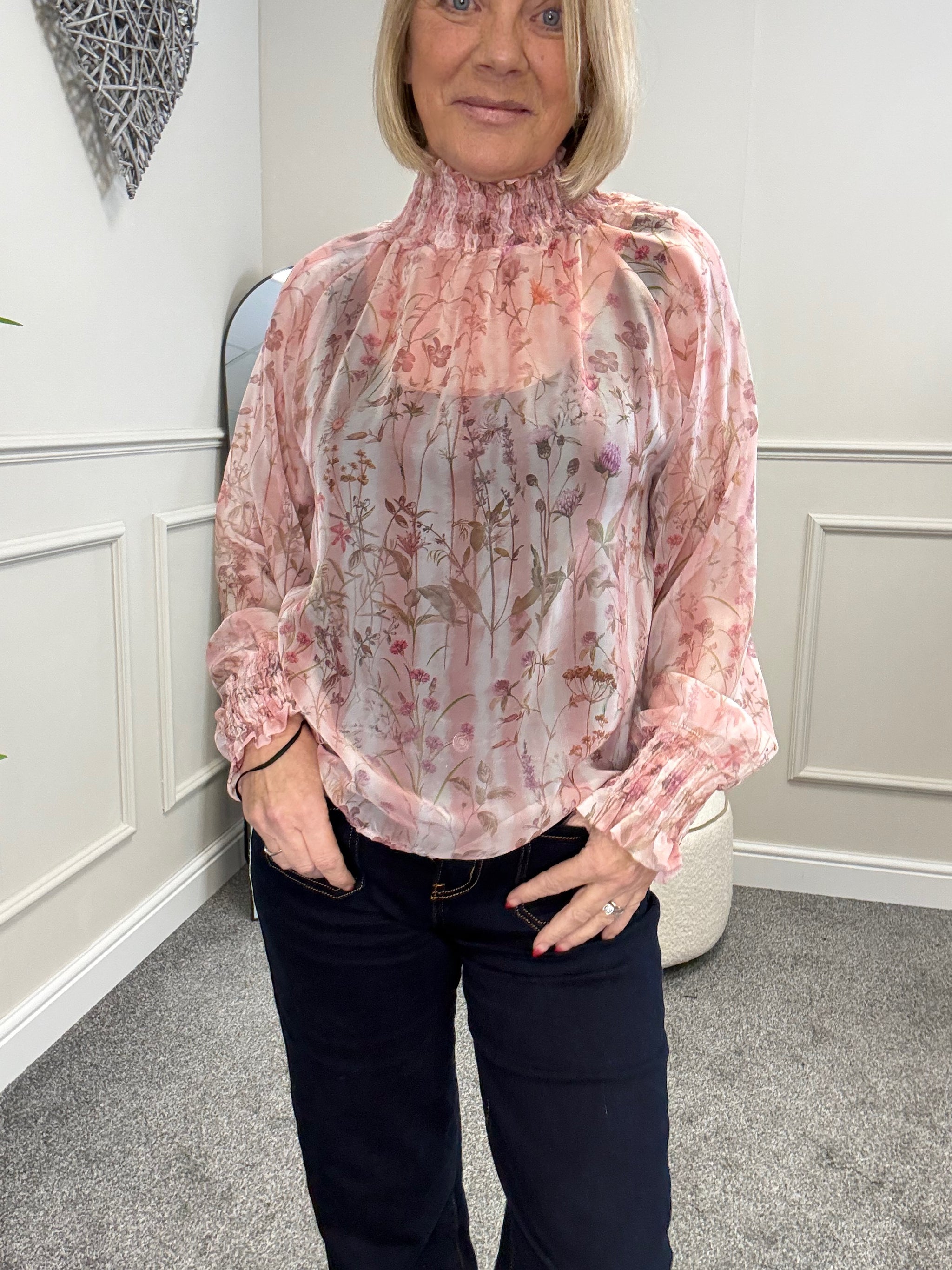 A beautifully lightweight floral blouse with soft sheerness and elegant detailing.