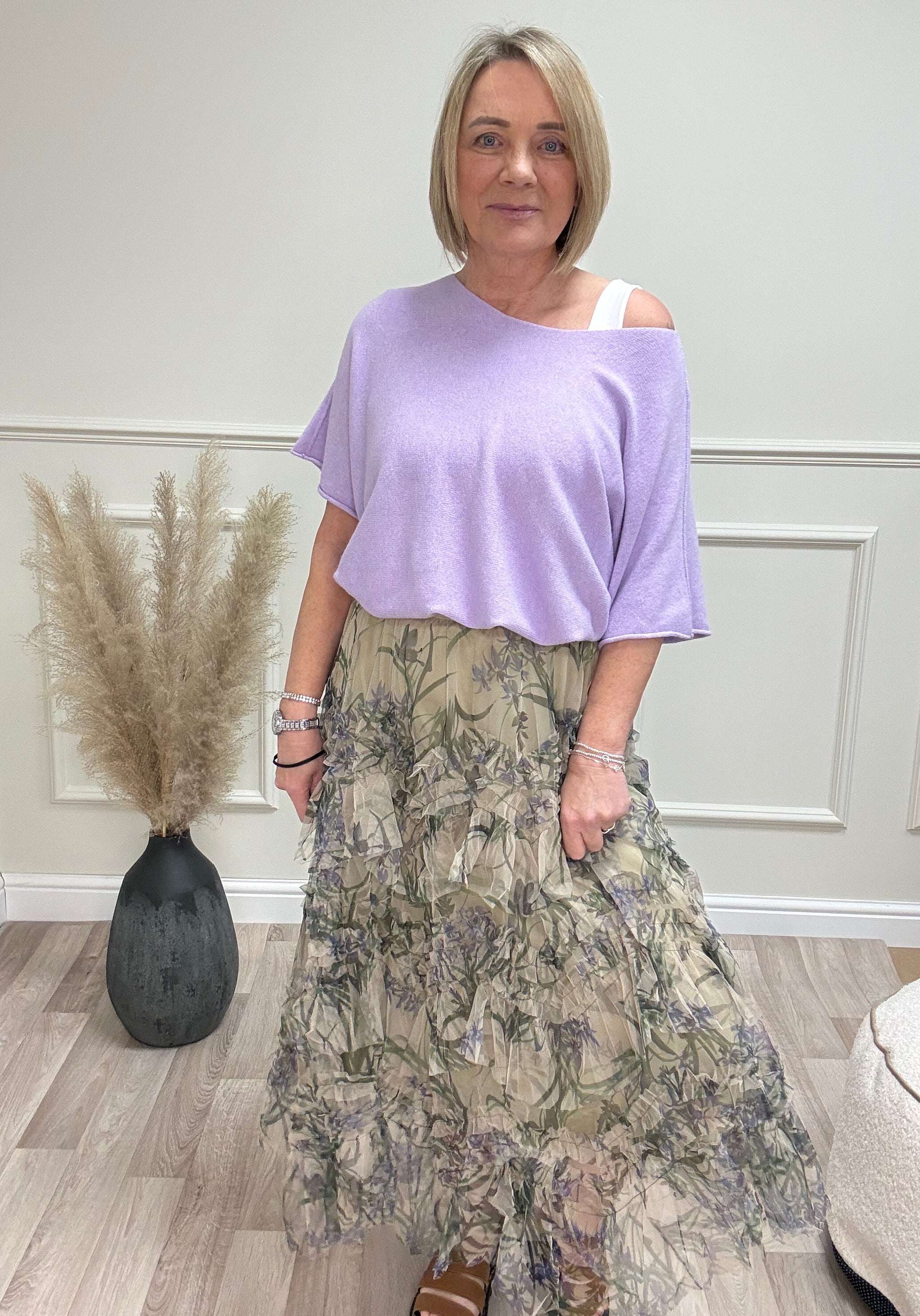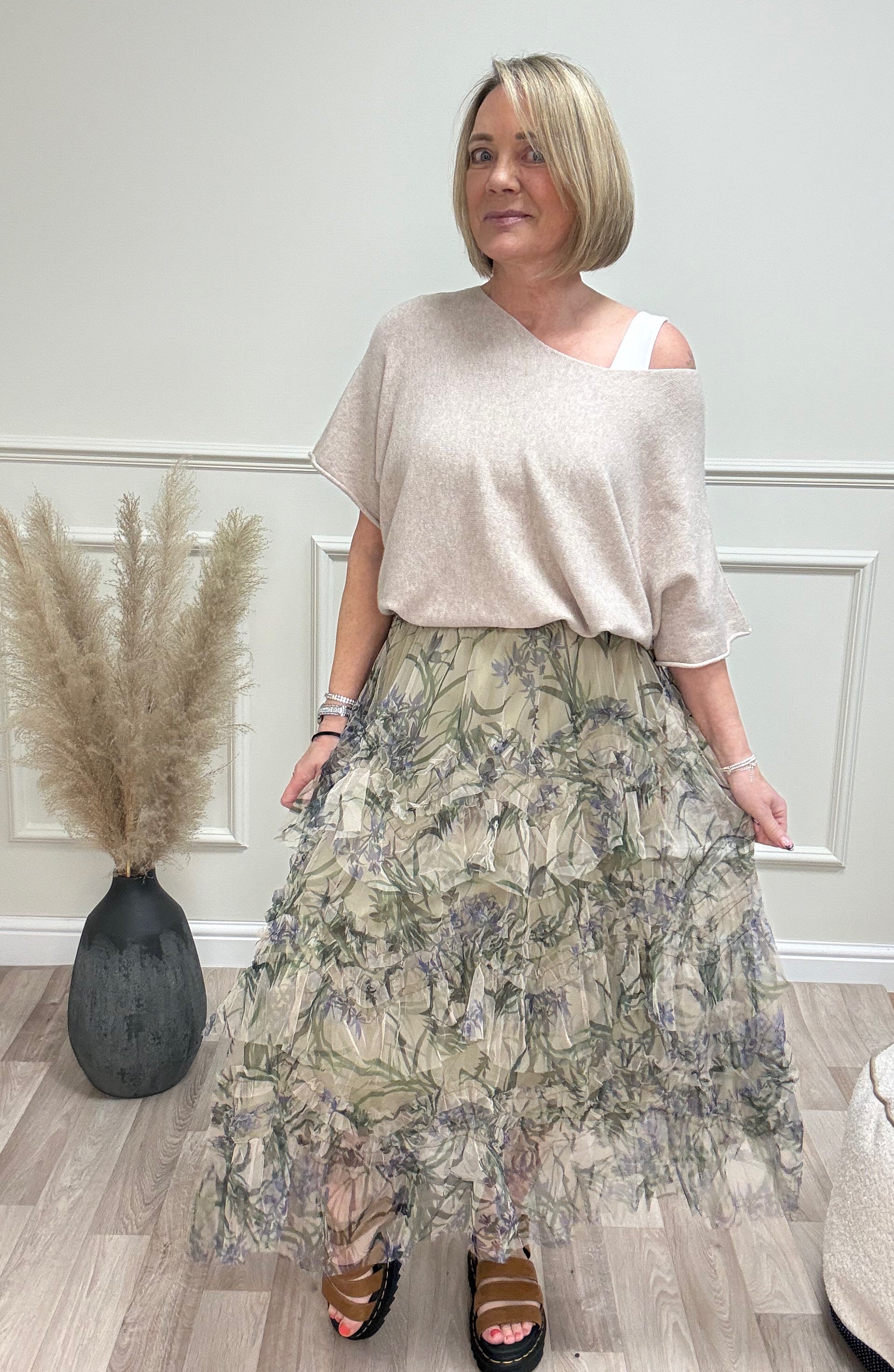 Made from layers of soft mesh tulle in a delicate pastel floral print, this skirt gives effortless elegance with a hint of whimsical charm.
