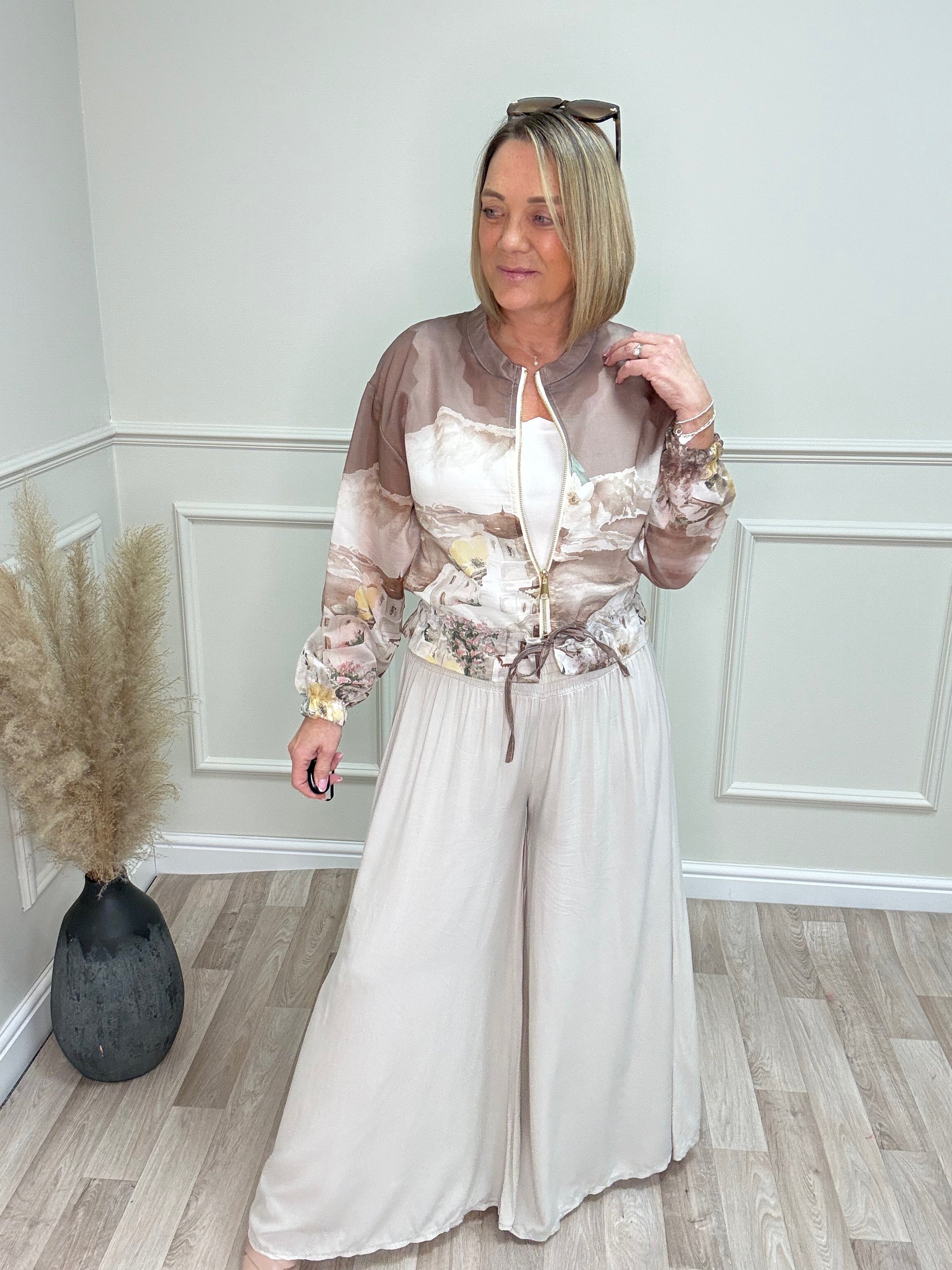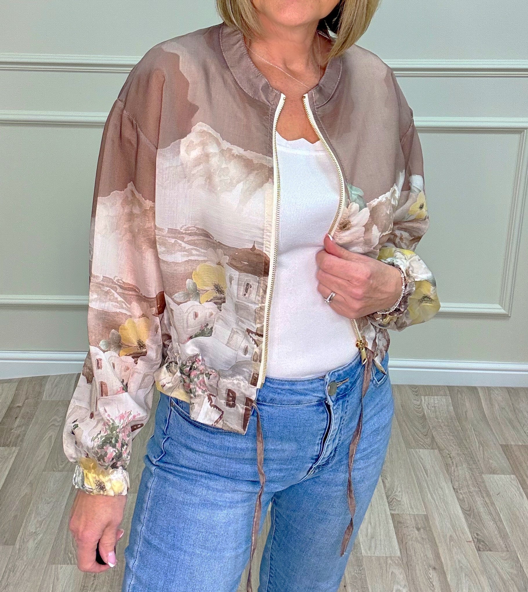 A lightweight, stylish bomber jacket in a soft sheerfabric with a subtle textured finish.