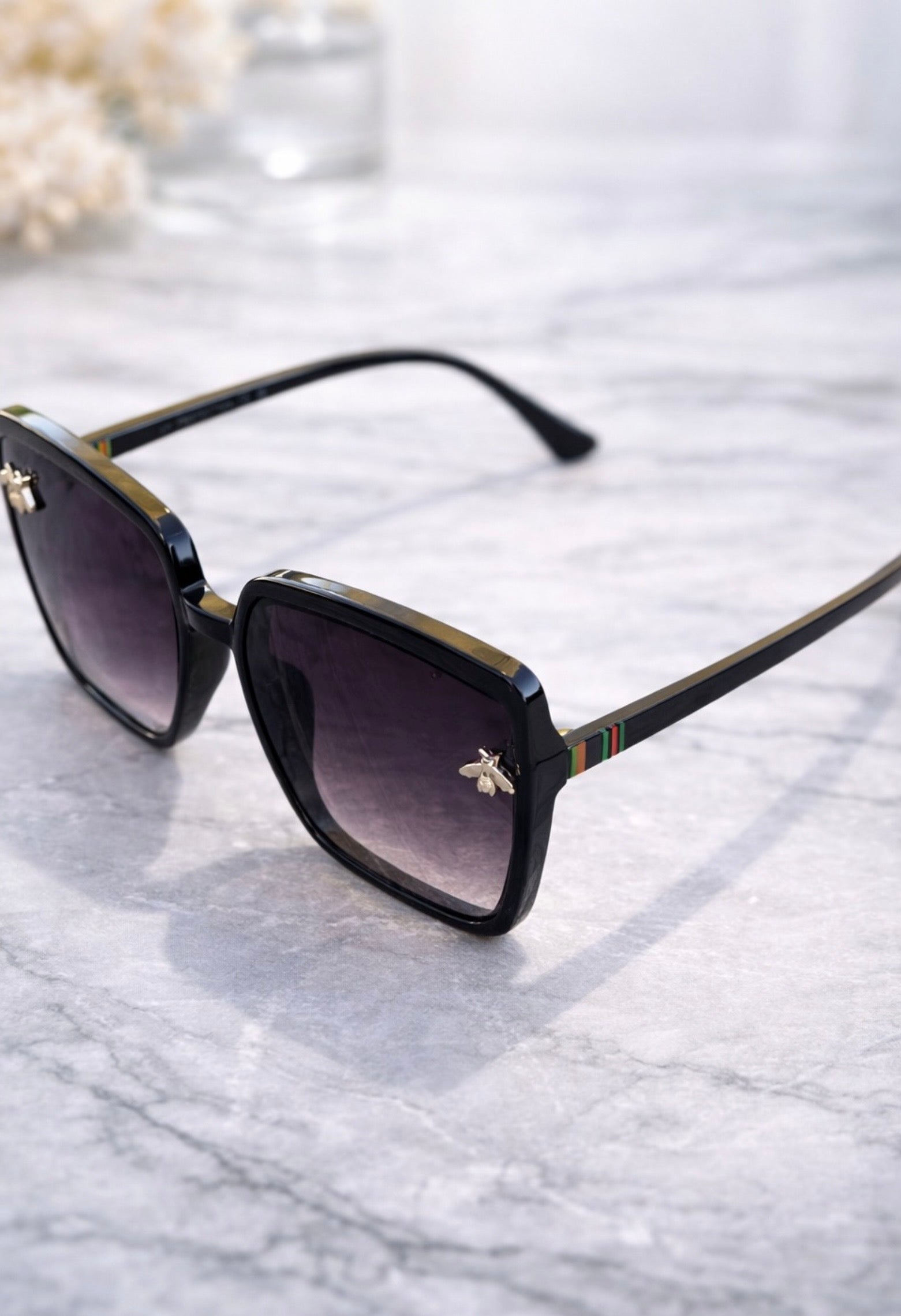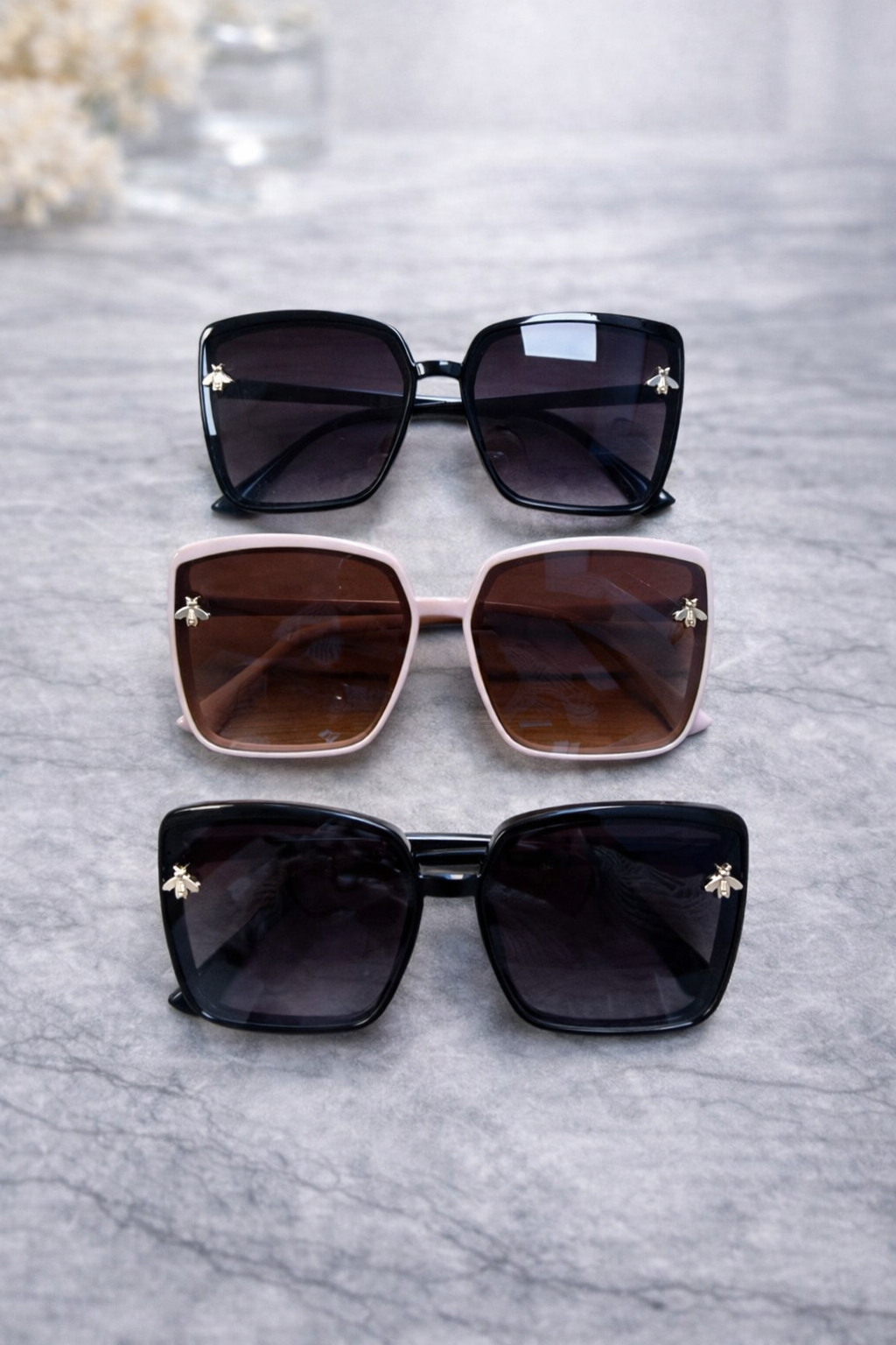 Elevate your everyday look with these statement oversized sunglasses featuring luxe bee detailing and a subtle designer-inspired stripe arm.