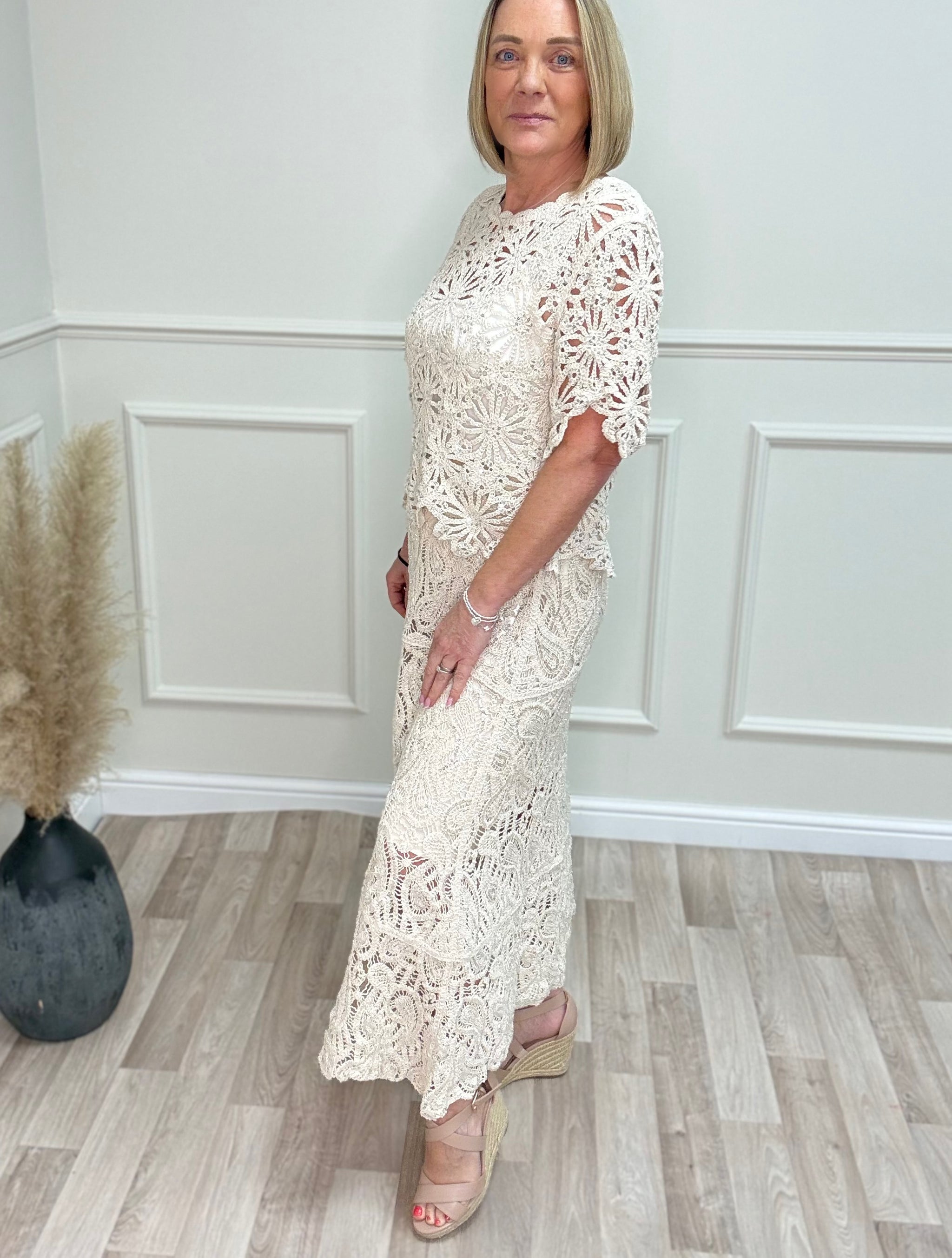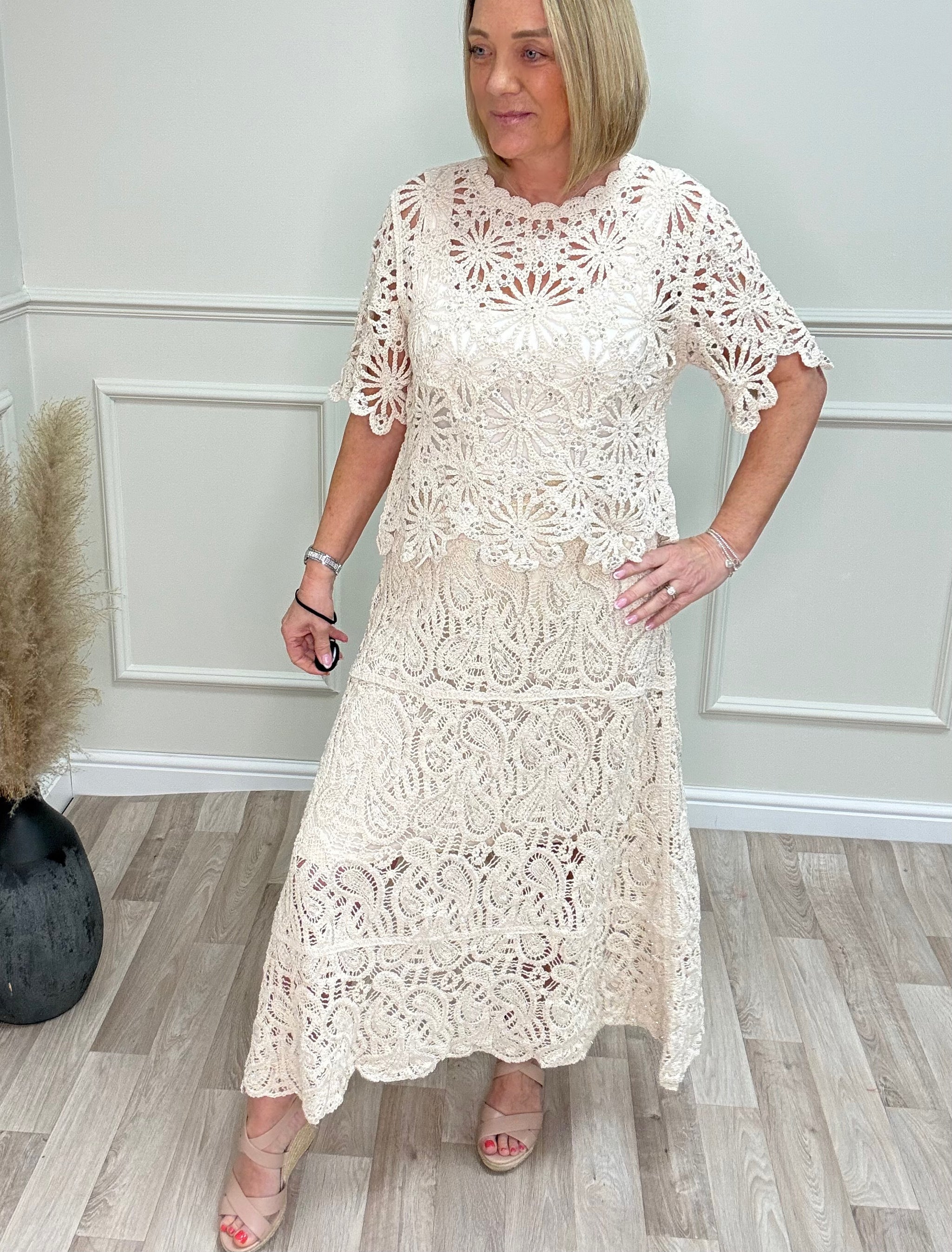 A stunning crochet midi skirt with delicate sequin detailing for an elegant, feminine finish.